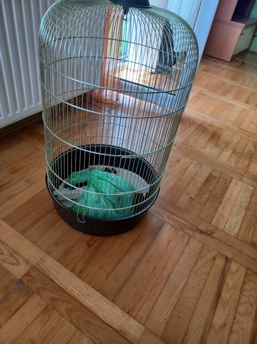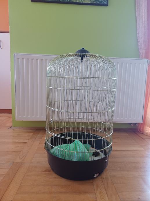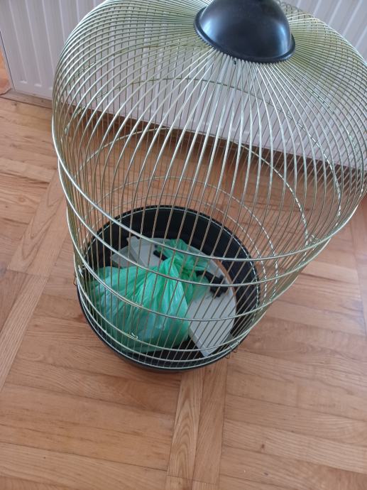 Veliki kavez za ptice sa svim dodacima (ljuljačka, 2 prečke za stojanje, 2 hranilice, posuda za vodu i 2 podne tacne koje se mogu izvlačit za čišćenje) u vrlo dobrom stanju. Promjera 40cm i visine 65 cm.