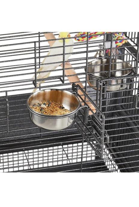 Sofisticirani dizajn: zahvaljujući vratima za hranjenje koje se mogu zaključati, hranilice su dostupne bez otvaranja glavnih vrata, tako da možete puniti hranilice izvana i ne morate riskirati da vaša ptica nenamjerno napusti kavez. Iznad svake hranilice nalazi se stup kako bi spriječio vaše ptice da podignu zdjelu i pokvare hranu. Štitnik za sjemenke može spriječiti ispadanje hrane iz kaveza i održavati vašu sobu čistom.