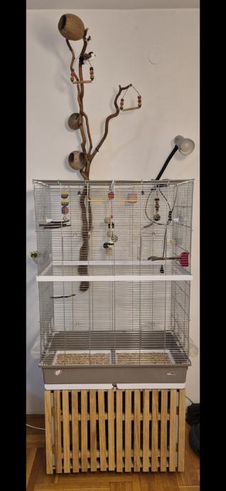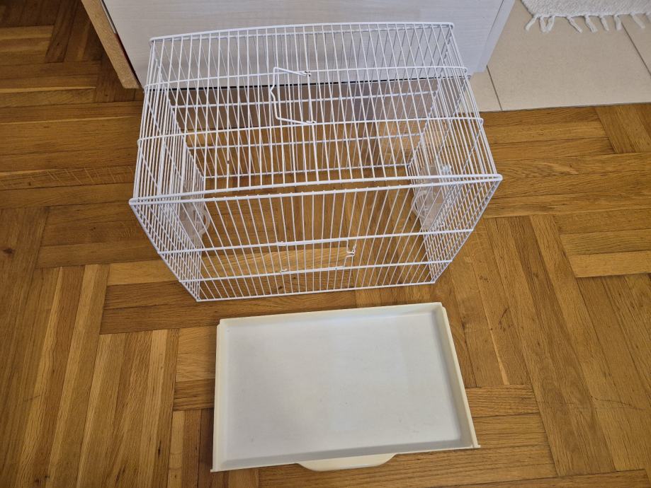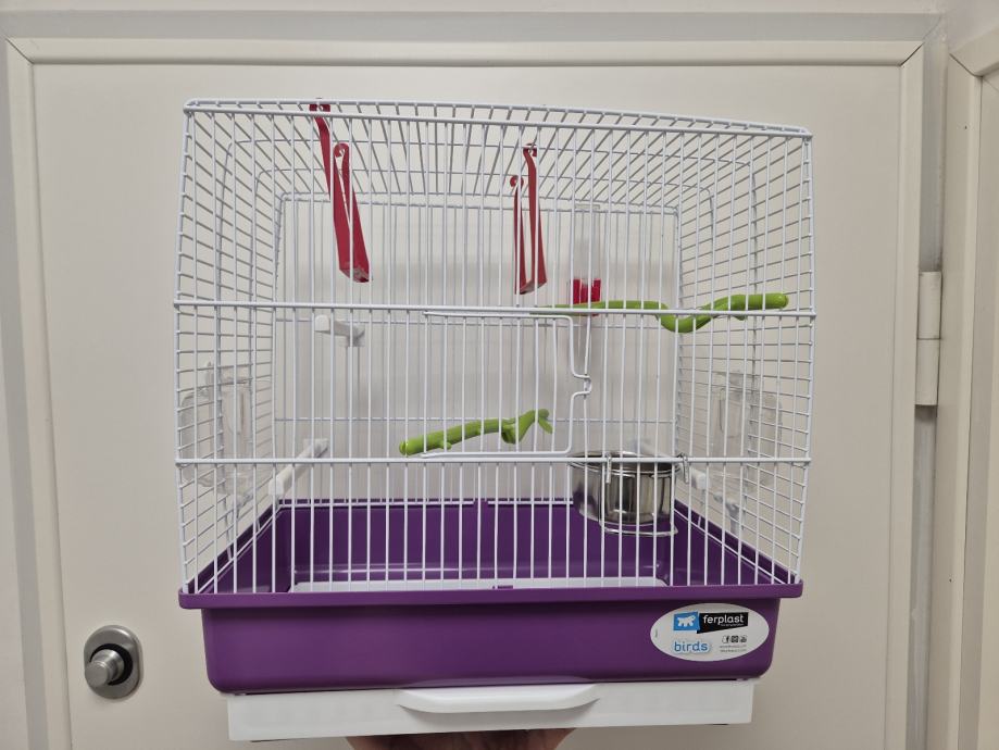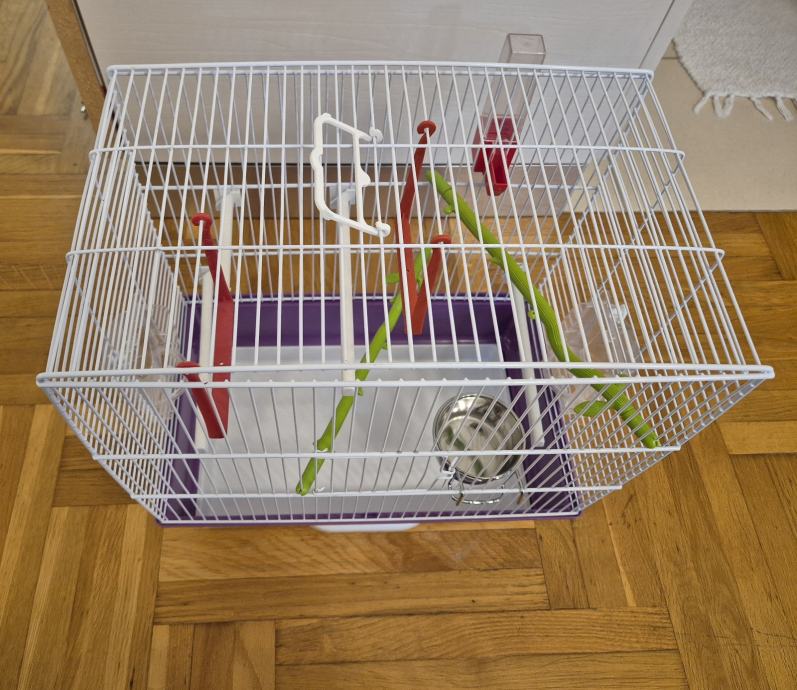 Nov star oko pola godine, služio za čuvanje papiga kad smo bili na godišnjem. Ima 2 hranilice, 1 pojilicu, 4 bijele prečke od plastike, 2 plastične ljuljačke, 1 metalnu zdjelu, ima svoju ladicu za vađenje.