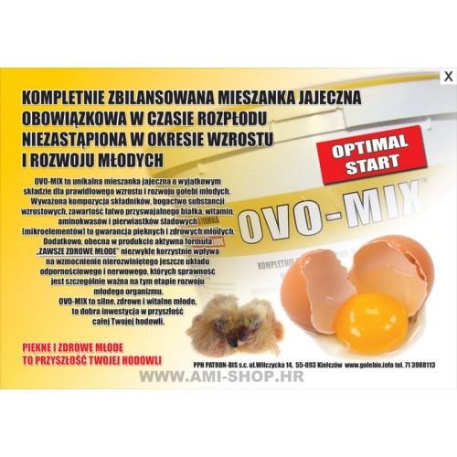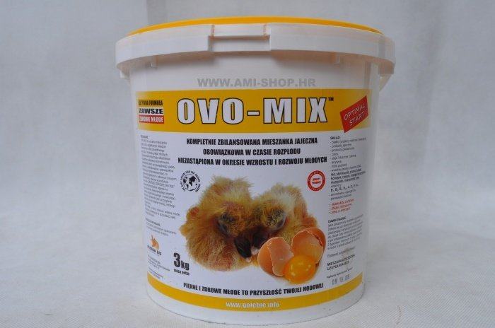 Ovo-Mix 3 kg je potpuno uravnotežena i jedinstvena mješavina jaja obvezna tijekom uzgoja mladih , nezamjenjiva u razdoblju pravilnog rasta i razvoja mladih golubova.Ovo mix ima uravnoteženi sastav komponenti koje sadrže tvari rasta , sadrži lako probavljive bjelančevine , aminokiseline , vitamine…koje posebno utiču na imunološki i živčani sustav što je vrlo važno u razvoju mladih golubova . Jednostavno rečeno Ovo mix je odlična investicija za daljnji razvoj golubova.