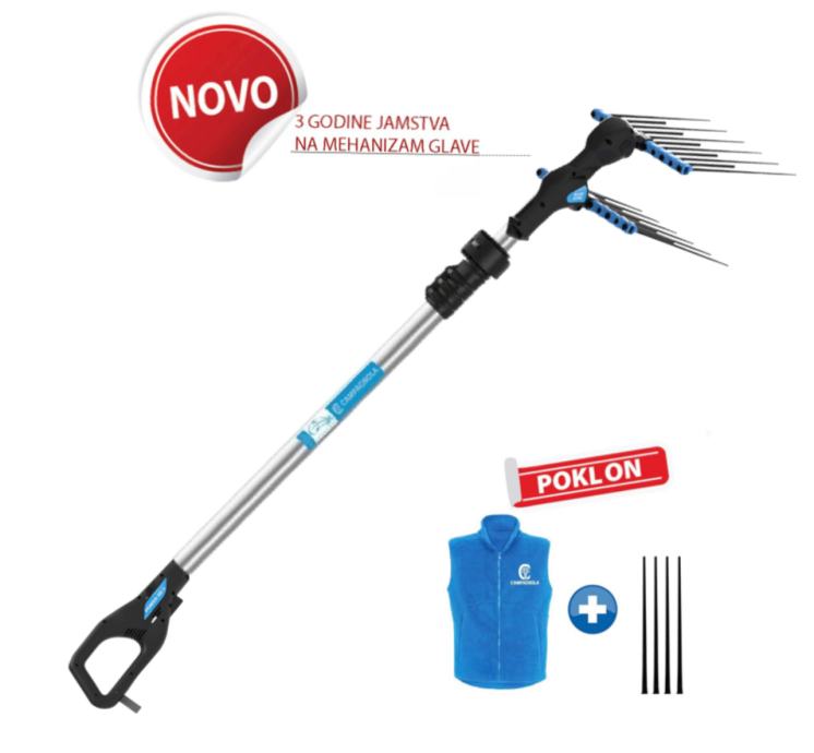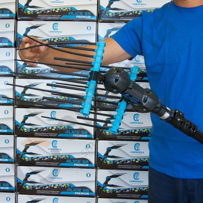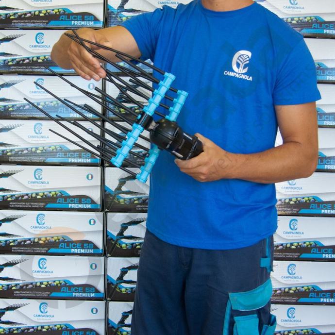 ALICE STAR 58 PLUS akumulatorski je tresač maslina opremljen fleksibilnim, otpornim i zamjenjivim zubima od tehno-polimera i fleksibilnim poliuretanskim kabelom za napajanje. Ovaj model opremljen je aluminijskim teleskopskim produžetkom od 185 do 270 cm, te se tresač može napajati pomoću litijskih ili standardnih akumulatora 12V, kao i elektro-agregatom Campagnola Energy 4 koji omogućuje istovremeni rad s 4 tresača.