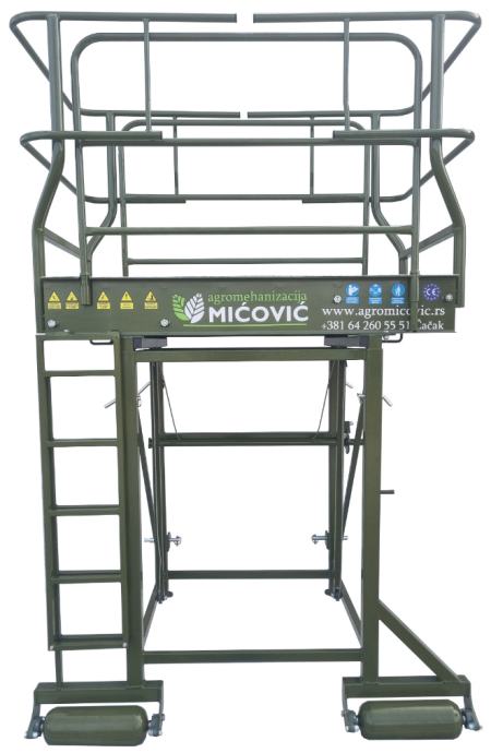 Traktorska voćarska platforma proizvođača Agromehanizacija Mićović namijenjena je branju plodova, rezidbi voćki, postavljanju zaštitnih mreža iznad voćnjaka i drugim radovima u proizvodnji voća.