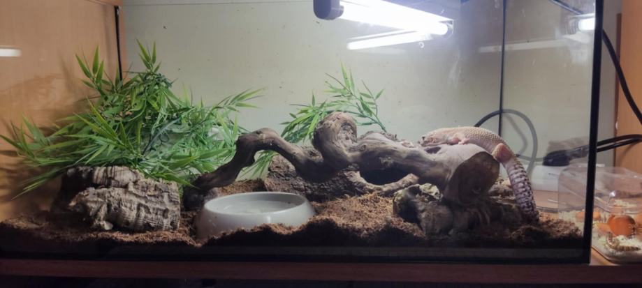 Prodajem akvariji ali koristen kao terarij. U njemu je prije boravio leopard gekon, ali sada ima novi, veći terarij koji je ručno izrađen. Ovaj manji akvarij želim dati nekome kome bi mogao koristiti – primjerice za mlade guštere ili glodavce.