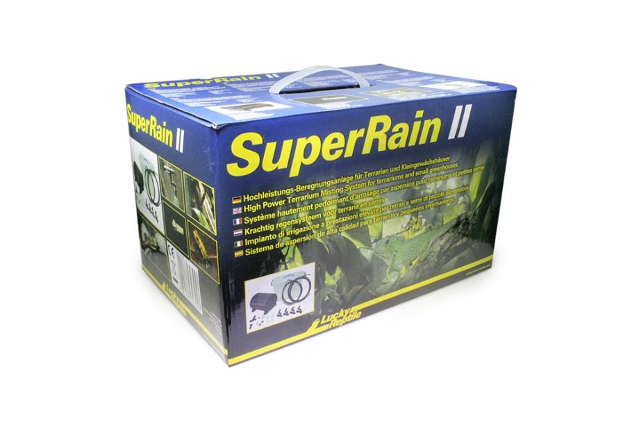 Lucky Reptile Super Rain II nova je i poboljšana verzija Super Rain s mirnijom i snažnijom pumpom koja omogućuje dodavanje produžnih mlaznica za veće postavljanje.