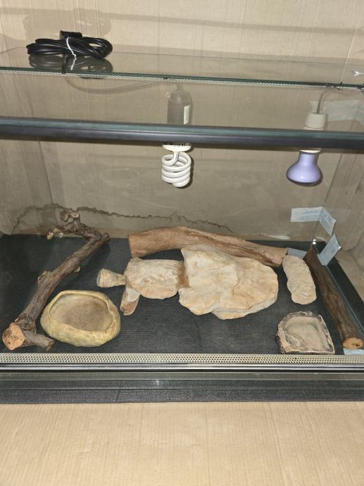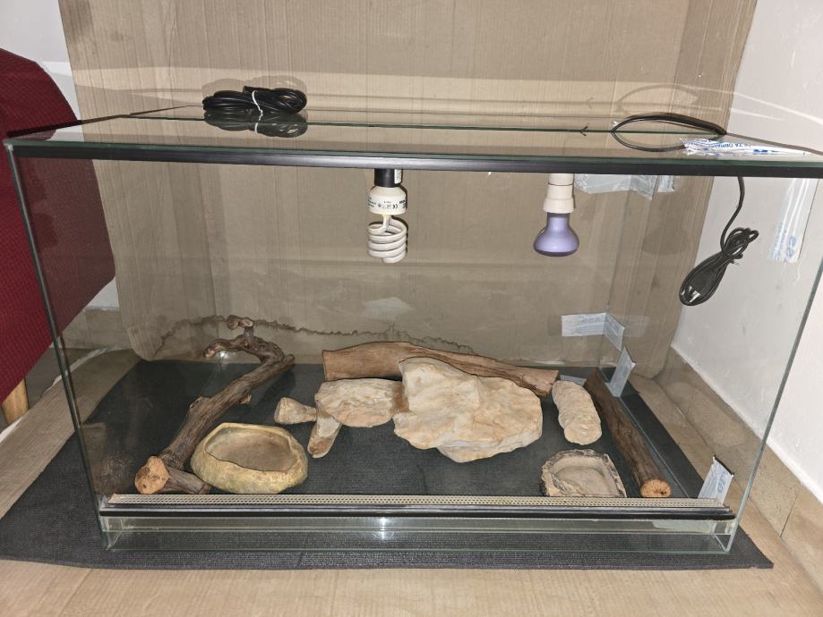 Terarij 80x50x50 u dobrom stanju sa gumenom podlogom, sa svim dodacima. Grane od loze za penjanje, posudice za hranu, te morska stijena i skrovište, uz par kamenih ukrasa. Posude za držanje žive hrane, velika pinceta, te pribor za održavanje pijeska.