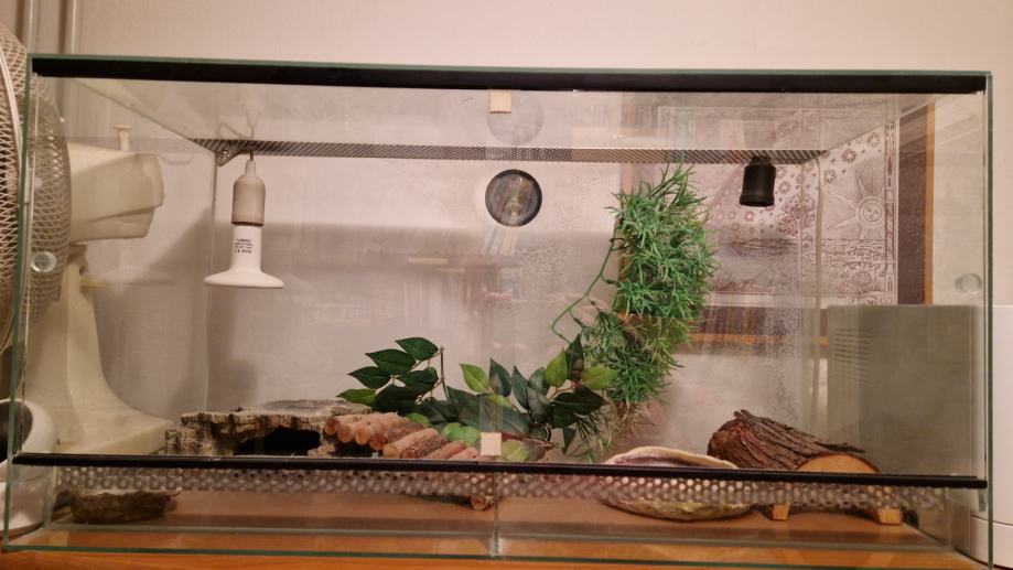 Uz terarij dolaze 2 grla za žarulje s 1 termo grijačem, termostat, posuda za vodu/hranu, pećina, umjetne biljke te drvene penjalice