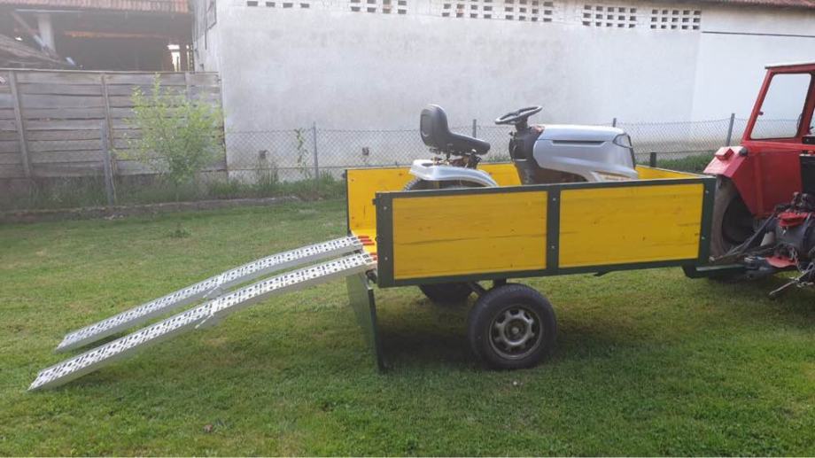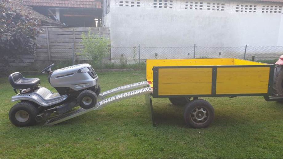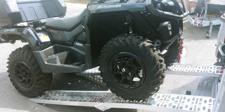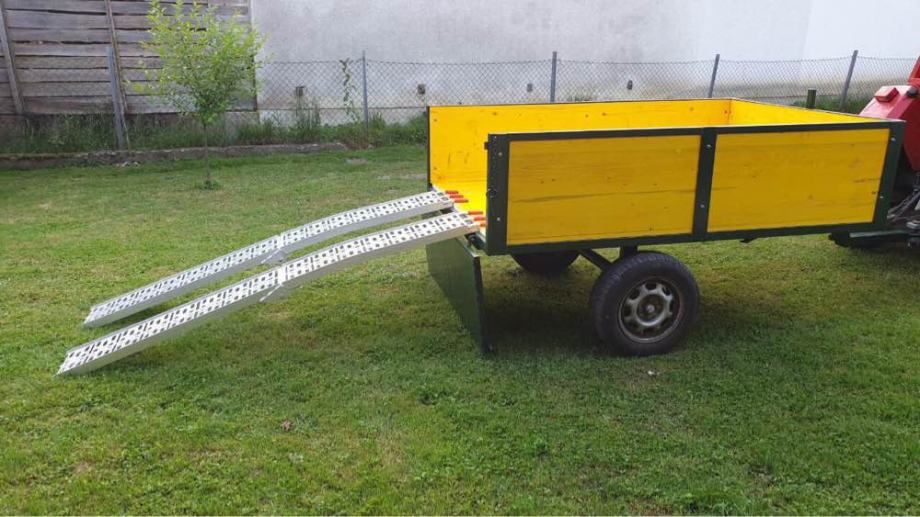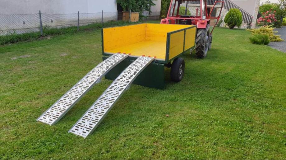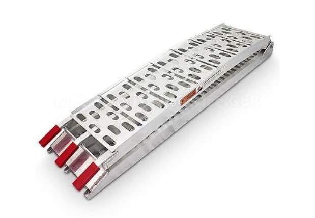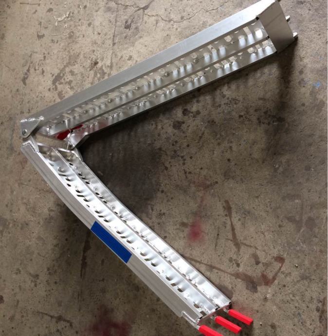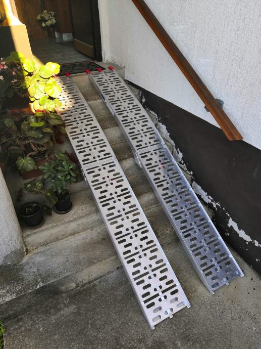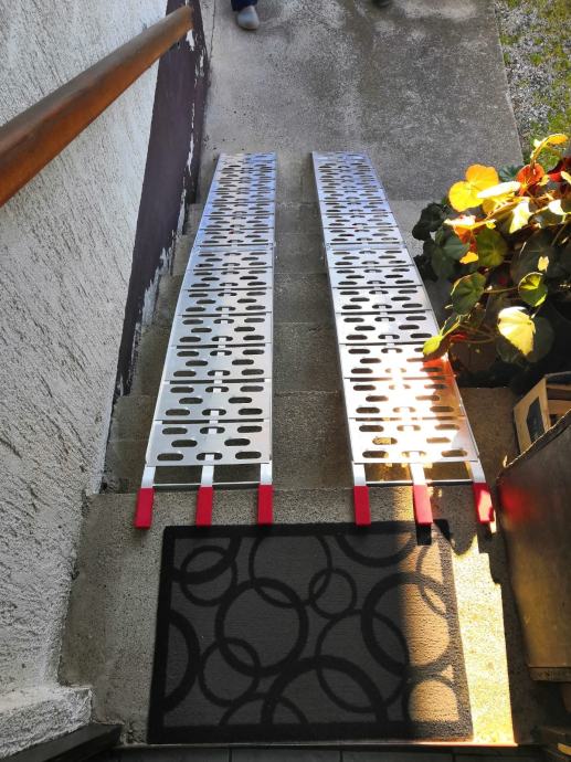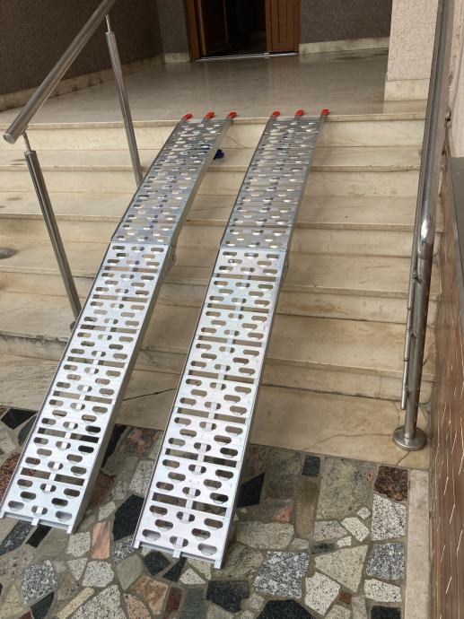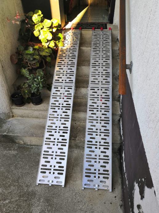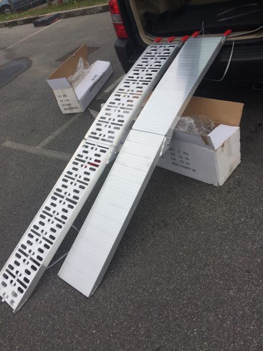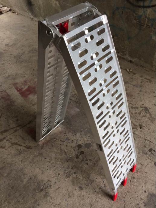 Nova zapakirana aluminijsko preklopivo-perforirani navozna / mobilna / utovarna / moto rampa (par/set) za utovar/transport (mobilnih kosilica, mini i malih (japanskih) traktora, mopeda, skutera, quada, cestovnih motocikla ili choppera do ukupne mase od 340 kg, težih kolica za invalide, lakih građevinskih strojeva, kosačica, snježnih freza, motornih sanjki, motokultivatora, teških građevinskih kolica, različitih rudla (kolica s dva kotača) s velikim teretom ili teških natovarenih sanduka/kolica do 680 kg...) za utovar u auto prikolicu, kombi, za prijenos preko stubišta (do 5 standardnih stepenica) i sl. duljine 228 cm, širine staze 28,5 cm i debljine 5 cm i ukupnog opterećenja (za par/set) od 680 kg.
