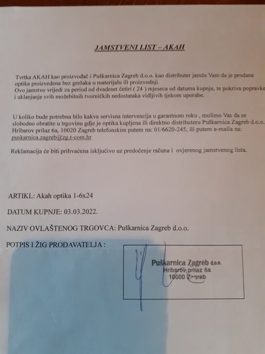 Optika je kupljena prije 6 mjeseci te ima garanciju 24 mjeseca. Sa optikom dajem i nosače za pikantini šinu.
