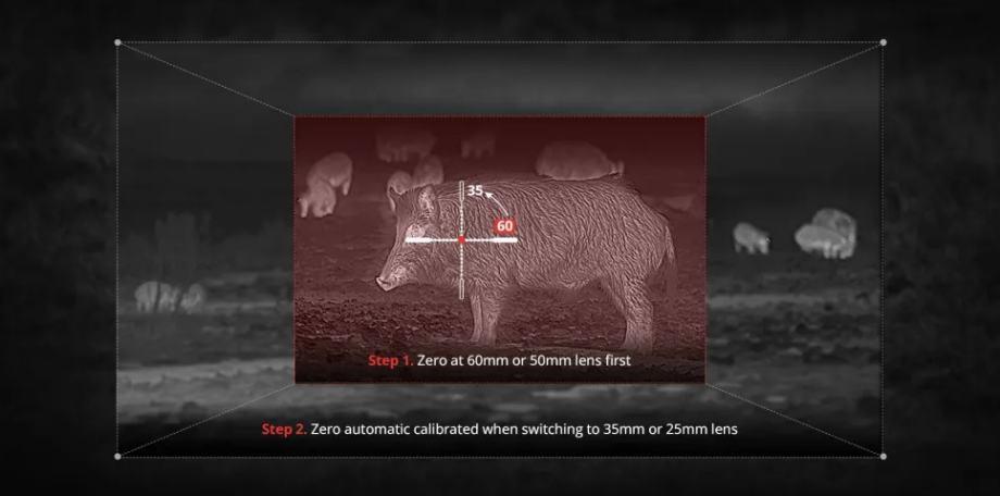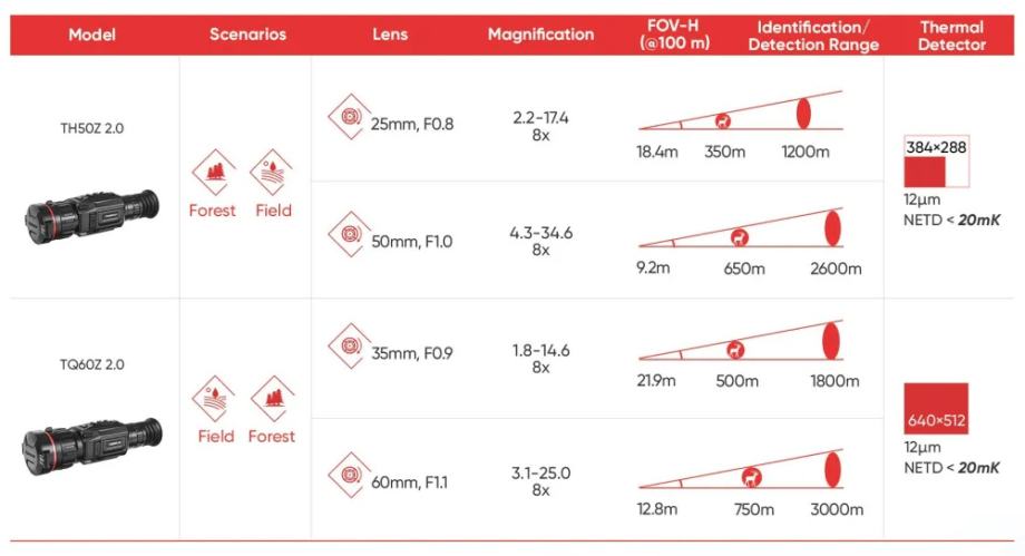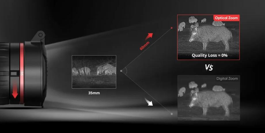 Hikmicro Thunder TQ60Z 2.0 je termalna optika sa senzorom rezolucije 640x512, dvije optičke leće 35mm/F0,9 i 60mm/F1,1 različitih fokalnih vrijednosti, velikog vidnog polja od čak 22m i početnog povećanja od 1,8x. Bilo da lovite u šumi ili na otvorenom polju, TQ60Z 2.0 je idealna termalna optika za Vas.