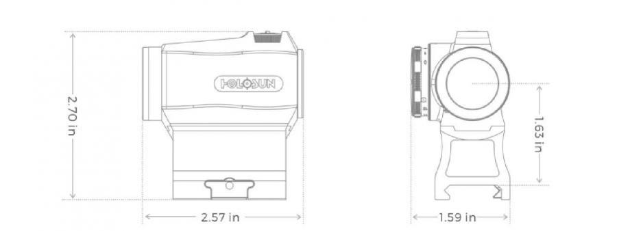 Slovo 'R' označava da uređaj ima rotacijski prekidač za podešavanje intenziteta osvjetljenja umjesto dva gumba koja se nalaze na većini Holosun crvenih točkica. Prekidač se nalazi pored odjeljka za baterije, na bočnoj strani uređaja. Ovaj uređaj dolazi s oklopljenim pokrovima poklopaca tureta. 'RD' označava da ovaj prizor crvene točke ima crveno osvjetljenje.