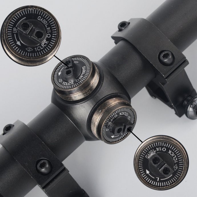 - korekcija pogotka: 1/4 M.O.A. (1 klik = 7 mm/100 m)