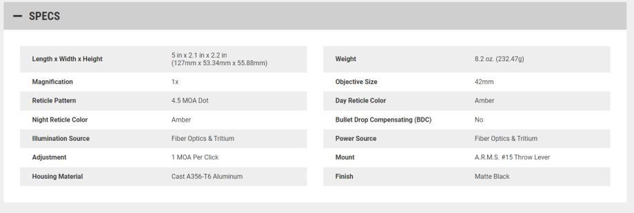 4.5 MOA Amber Dot Reticle, Reflex Base, A.R.M.S.® #15 Throw Lever Flattop Mount