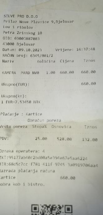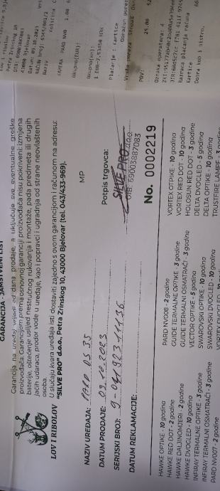Prodajem navedenu optiku .Kupljena je u 11mj 2023 račun i garancija vrijedi još 18 mjeseci.Samo stavljena na pcp pušku i isprobana i dalje stoji .Ima mogučnost snimanja na karticu ispajanja preko wf na mobitel.Po danu je slika u boji a po noči crno-bijela .Cijena 500e nova je bila plačena 660e.Sve informacije na broj 0981826091