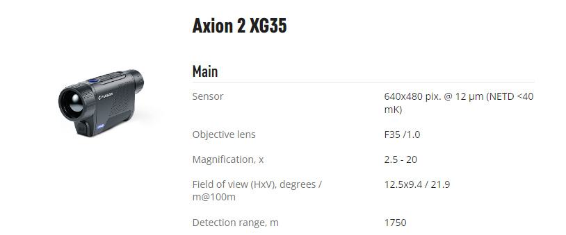 Termovizijski uređaji Axion 2 koriste novi pristup optimizaciji slike ovisno o svrsi i uvjetima promatranja te pružaju visokokvalitetno prikazivanje ciljanih objekata i pozadine. Tri razine pojačanja signala u kombinaciji s povezanim filterom za izravnavanje i finim prilagodbama svjetline i kontrasta daju lovcu velike mogućnosti za dalekosežno otkrivanje životinje u različitim vremenskim i temperaturnim uvjetima te određivanje njezinih trofejnih kvaliteta.