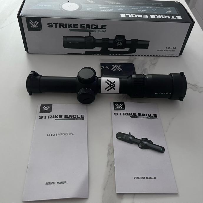 Prodajem Vortex Strike Eagle 1-8x24 optički nišan, potpuno nov. Dolazi u originalnoj kutiji s pripadajućim priručnicima i dokumentacijom. Prikladan za lovačke puške i sportsku upotrebu, s mogućnošću podešavanja povećanja od 1x do 8x i objektivom promjera 24mm.