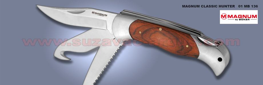 Ovaj klasičan višenamjenski džepni nož 02MB136 (Magnum Classic Hunter) idealan je za lov, planinarenje, pješačenje i ostale aktivnosti na otvorenom. Model sadrži oštricu Bowie oblika, kuku za hvatanje te pilicu za piljenje drva i kostiju. Izrađeni su od nehrđajućeg čelika 440, a njihov back lock mehanizam sprječava slučajno otvaranje oštrica. Drvene obloge drške u kontrastu s nehrđajućim čelikom daju nožu jedan veličanstven izgled. Ima rupu za uzicu, nema kvačicu.