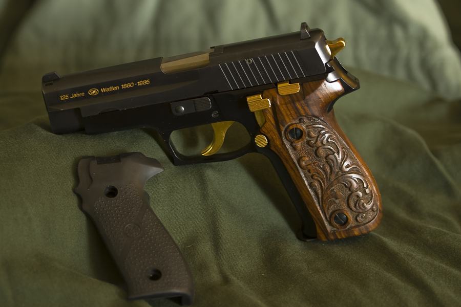 Pištolj SIG-SAUER JP226, Luksuzna inačica najboljeg pištolja na svijetu, proizveden povodom obljetnice tvrtke SIG (125 god.,1860-1985) u maloj seriji od 3000 kom.,luksuzno opremljen, orahove korice i pozlata, pištolj je u odličnom stanju, uz pištolj dajem rezervne hogue gumene korice i rezervni okvir za 17 metaka, cijena 1300 EUR