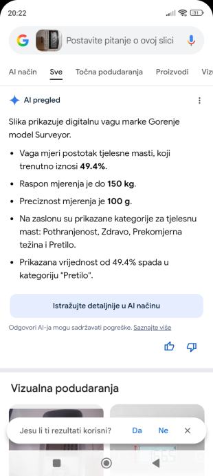 Odlična digitalna vaga Gorenje -Surveyor koja važe do 150 kilograma,ali tvrdim da vaze i debelo preko jer se covjek sa 170 i nesto kila izvagao i vaga je pokazala u gram,( ima u slikama) .Vaga ima vise od 10 funkcija,od tjelesne mase,ukazivanje na pothranjenost ili na pretilost,postotak za idealnu težinu u omjeru sa visinom osobe koja se važe i jos dosta toga. Vaga je idealna za osobe koje započinju djetu,pamti vaganja svaki dan i moze pratiti napredak skidanja kilograma.Za sve informacije nazovite na broj 097-6601365 ili pošaljite upit na Viber ili Njuskalo, a Šaljem Poštom ili TISKOM ili u dogovoru sa kupcem ,stanje vage idealno,ja imam novu,slicnu Također Gorenje i tko ju kupi nece se prevariti,idu 4 male baterije,Vidi Slike!!Cijena povoljna posto ( imam dvije).