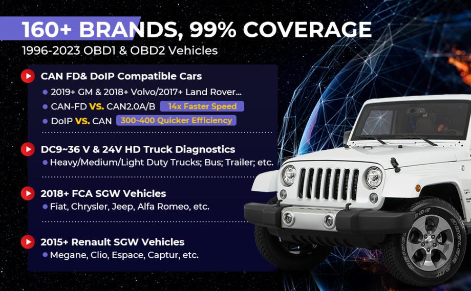 5. Povećajte pokrivenost vozila 1996-2024 (CAN FD & DoIP, FCA & Renault SGW pristup, HD dijagnostika kamiona, itd.).