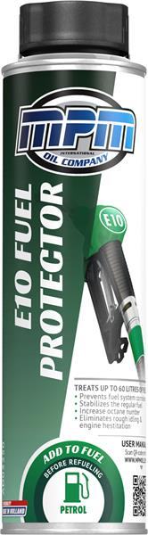 MPM E10 Fuel Protector štiti motor od negativnih učinaka modernog benzina koji sadrži etanol. Sve veće količine etanola mogu dovesti do dugoročnih negativnih učinaka. Goriva na bazi etanola imaju tendenciju starenja brže od običnih goriva i gube svoj oktanski broj. Gorivo E10 ima higroskopni učinak i 1-3% negativan učinak na potrošnju goriva u odnosu na gorivo E5. Ovaj E10 Fuel Protector je sveobuhvatan tretman goriva koji pruža zaštitu od korozije, zaštitu od podmazivanja sjedišta ventila i osigurava dodatno povećanje oktana. Prikladno i za vozila sa sustavima za naknadnu obradu ispušnih plinova.