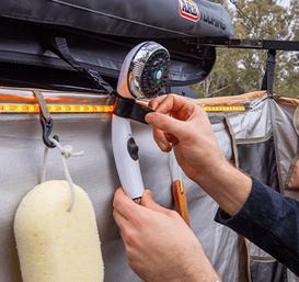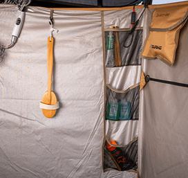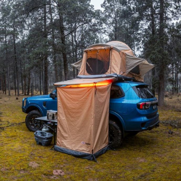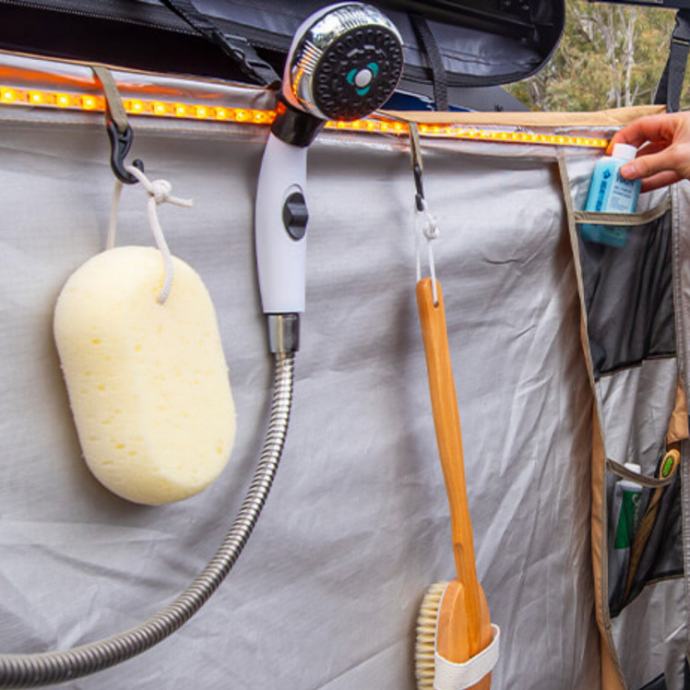Omogućuje privatno tuširanje, presvlačenje ili korištenje prijenosnog WC‑a tijekom kampiranja. Pruža zaštitu od vremenskih uvjeta zahvaljujući čvrstom platnu i integriranom krovu. LED rasvjeta omogućuje korištenje noću bez dodatnih lampi. Više pozicija za montažu tuša prilagođava se različitim navikama i visinama korisnika. Pod s odvodom osigurava čistoću i sprječava nakupljanje vode. Brzo postavljanje čini ga idealnim za overlanding, kampiranje i duža putovanja.