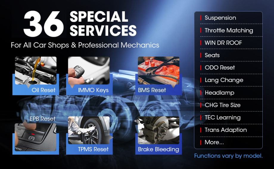 Dijagnostički alat obavlja više od 36 servisnih funkcija koje svaki mehaničar želi za različite planirane servise i održavanje. Kao napredni dijagnostički alat, MK808S ima sve vrste dostupnih usluga za kompletnu dijagnozu i održavanje.