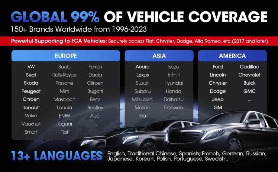 Globalna pokrivenost vozila: azijska i europska vozila nakon 1996. Koristi novu Auto VIN ID Tech za automatsku identifikaciju marke, modela i godine vozila bez potrebe za pomoći korisnika