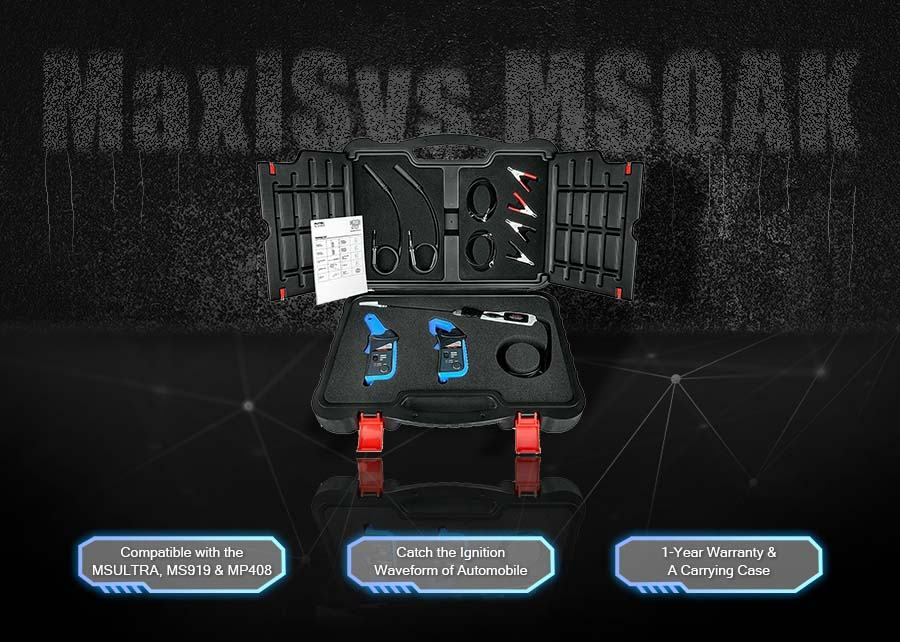 MSOAK, kompatibilan s MaxiFlash VCMI uključenim u MSUltra i MS919, i MP408 4-kanalni osciloskop (prodaje se odvojeno), uključuje 65A AC/DC strujnu kliješta, 650A AC/DC strujnu kliješta, Coil On Plug Probe, HT produžetak Kabel (2 kom) i kopča za bateriju (2 kom), unutar kutije za nošenje.