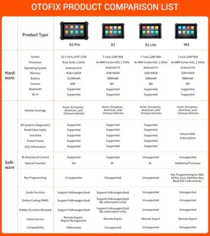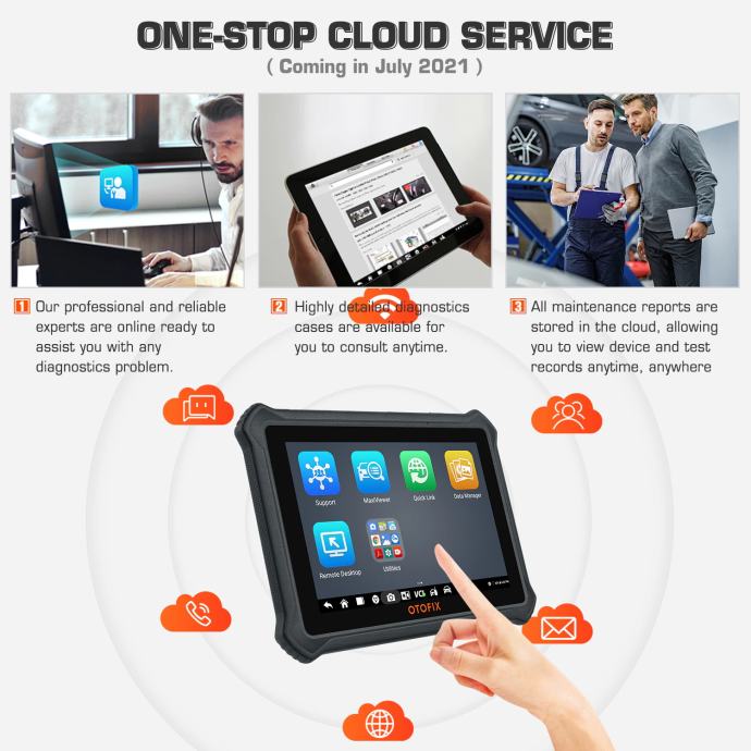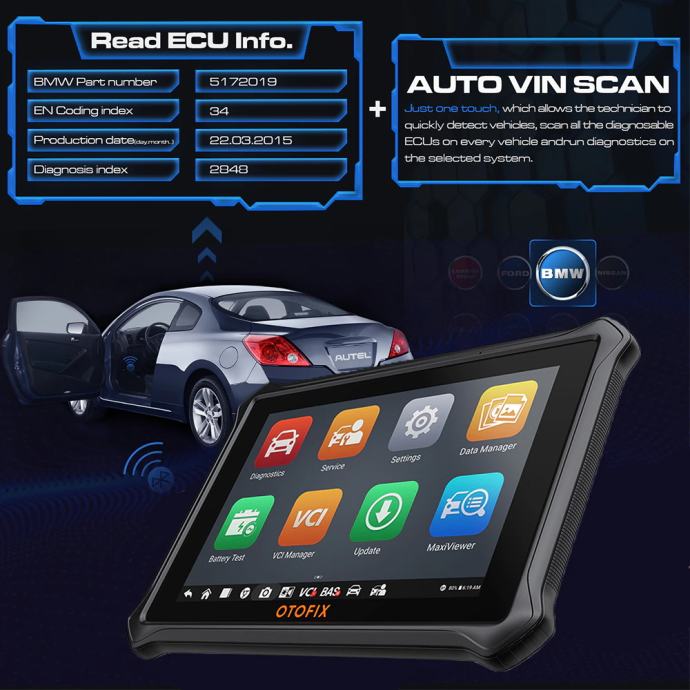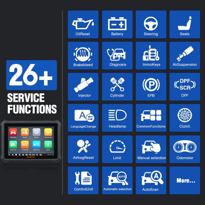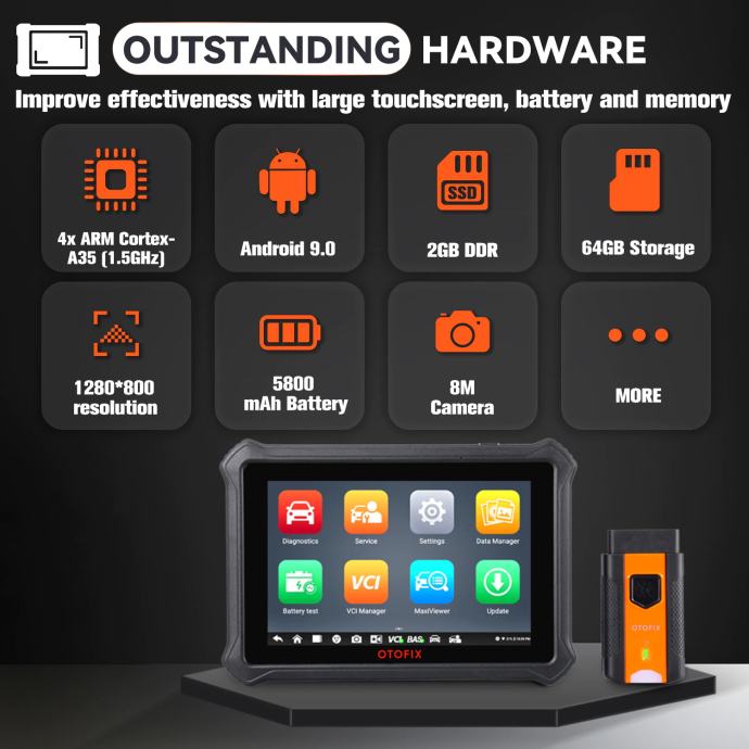OTOFIX D1 Inteligentni automobilski dijagnostički analizator je sve-u-jednom ručni alat za sve vaše potrebe za popravkom automobila „uradi sam“. OTOFIX D1 izgrađen je na Android 9.0 tabletu sa 7" LCD kapacitivnim zaslonom osjetljivim na dodir rezolucije 1280*800, ima 4x ARM procesor i 64 GB prostora za pohranu. OTOFIX D1 dijagnostički tablet podržava pametnu dijagnostiku za sve dostupne sustave vozila i predstavlja do 26 servisnih funkcija i nudi iznimnu dijagnozu na razini OE i analizu DTC-a. U kombinaciji s uslugom u oblaku OTOFIX pruža vam rješenja na jednom mjestu od dijagnoze do popravka