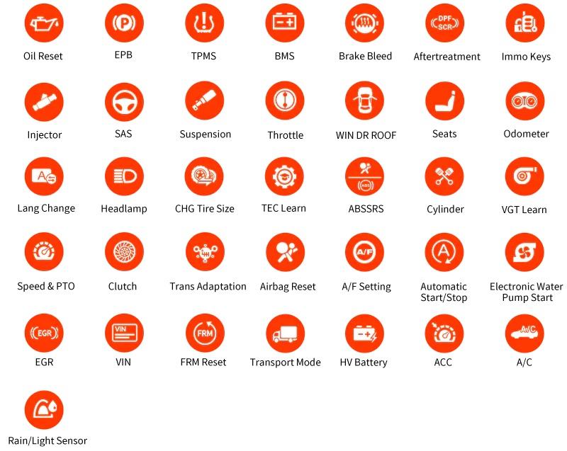 36+ servisnih funkcija - Ima više od 36 opcija servisnih funkcija, uglavnom uključujući resetiranje ulja, EPB uslugu, ponovno učenje TPMS ID-a, automatsko odzračivanje ABS-a, SAS kalibraciju, DPF regeneraciju itd.