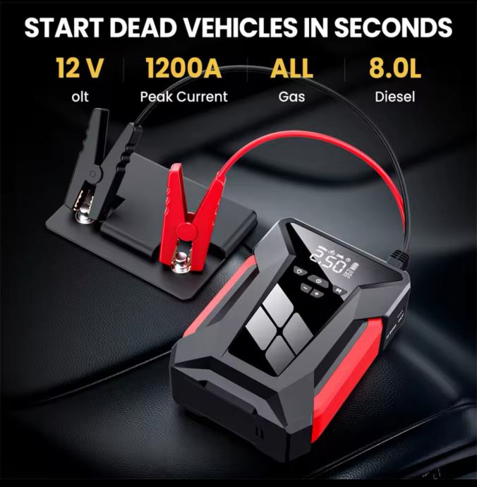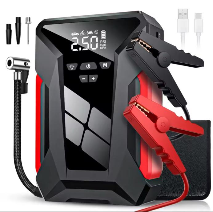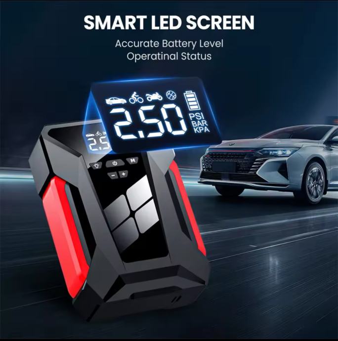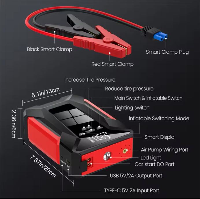 Novi starter odličnog dizajna i izgleda od 28000mAh, pumpa za gume, lampa, punjač za mobitele USB + USB-C, smart display.