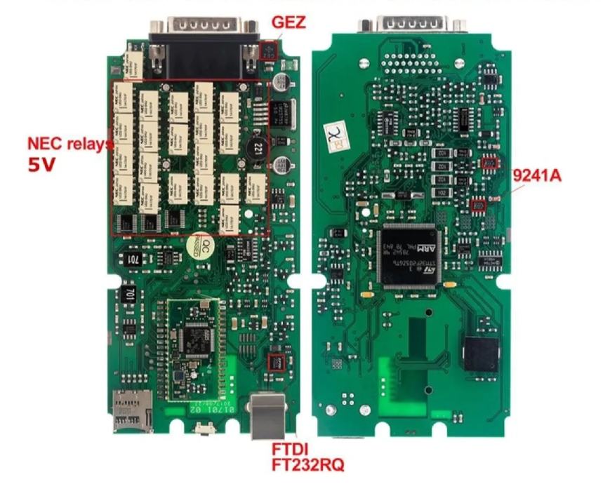Kvalitetni dijagostički uređaj Delphi sa jednom pločom, NEC relejima, FTDI232RQ čipom za kvalitetnu USB komunikaciju, GEZ SMCJ24V0©A prigušivač prolaznog napona, SI9241AEY Single-Ended Bus Transceiver za K i L linije, STM32F205ZCT6 Mikrokontroler, Firmware 3201, program za dijagnostiku Autocom 2020.23.