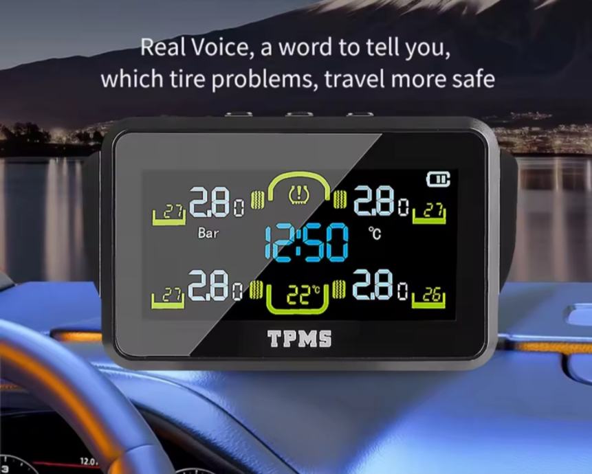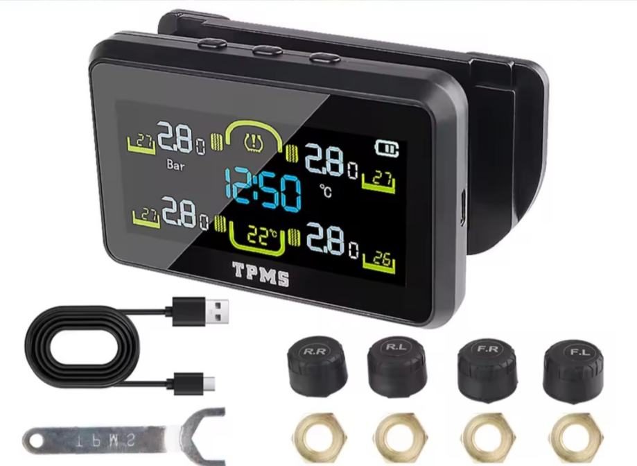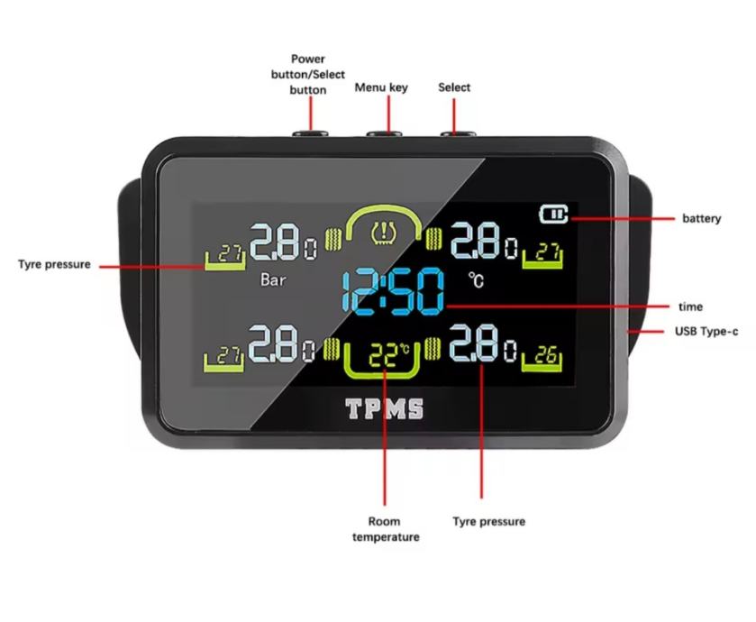 Uređaj sa kapicama ventila koje odašilju tlak u gumama i temperaturu. Alarm pritiska pada pritiska. Punjivo na C type ili solarni panel.