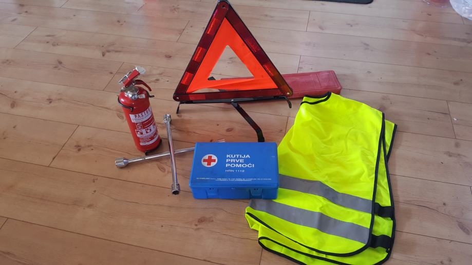 Refletirajući prsluk, kutija prve pomoći(kutija je puna, zaboravila se slikati otvorena, kod upita može se slikati i poslati), trokut, vatrogasni aparat ....
