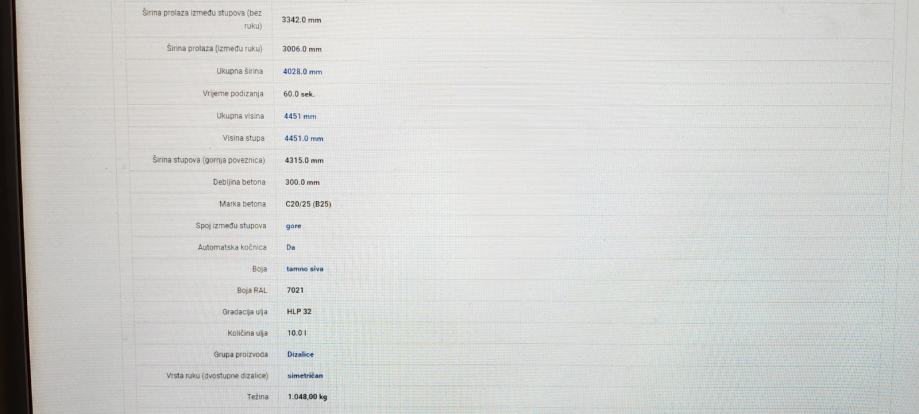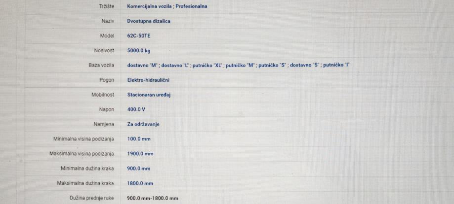 Dvostupna dizalica 62CE-50T simetričan, nosivost 5000kg,pogon elektro-hidraulični, napon 400v,ukupna visina 4451,automatska kočnica, APS sistem spuštanja
