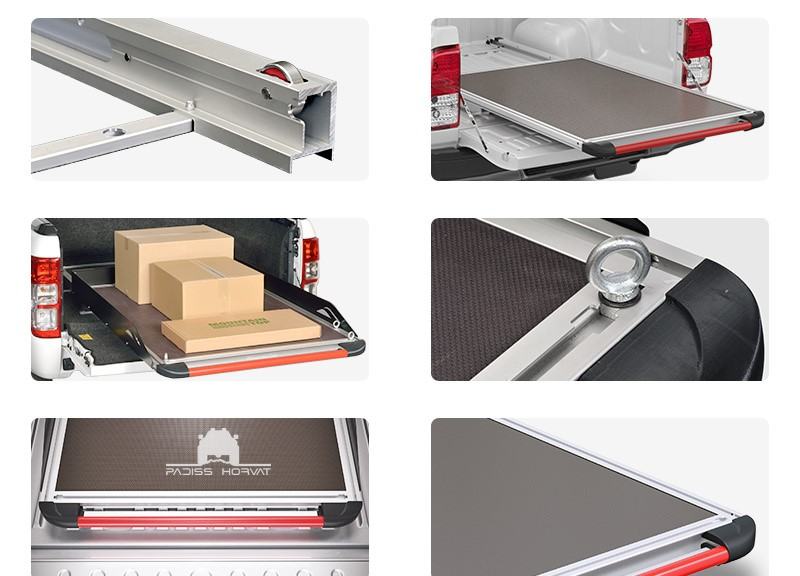 Klizna polica izrađena je od čvrstih aluminijskih profila koji osiguravaju snažan, ali lagan dizajn.Jednostavno pritisnite inovativnu ručku za glatko otvaranje i zatvaranje jednom rukom. Poprečna ručka je dizajnirana za jednostavan rad bez obzira na položaj ruke i može se aktivirati i sa sredine i sa strane. Integrirano vezivanje u profilima. Funkcionalnost police može se dodatno poboljšati dodavanjem bočnih ploča kako bi se manji dijelovi tereta držali na mjestu na polici ili vijcima s ušicom koji učvršćuju teret pomoću remena.