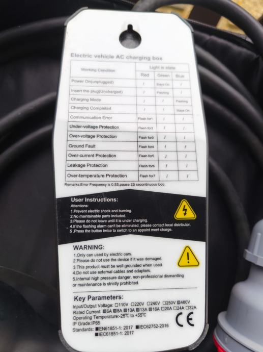 Punjač sa spaja na trofaznu industrijsku utičnicu CEE 16A 3P.