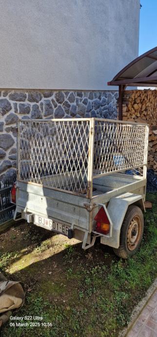 Prodajem laku prikolicu sa ogradom u dobrom stanju, registrirana do 24.04.2026. sa jednom rezervnom gumom.