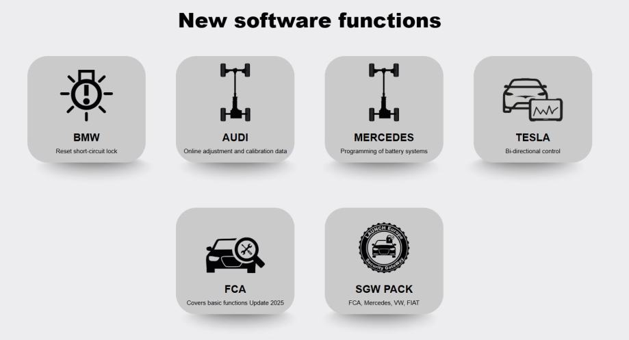 - Nove softverske funkcije: još brže skeniranje automobila, pregled trenutnih podataka iz više sustava istovremeno, vizualizacija posebnih funkcija u stvarnom vremenu, pristup punom SGW paketu, dijeljenje zaslona na 2 u 1 (dijagnostika / baza podataka) i nove ekspertne funkcije za automobile kao što su BMW, Audi, Mercedes-Benz, Tesla, FCA i druge marke i druge funkcije
