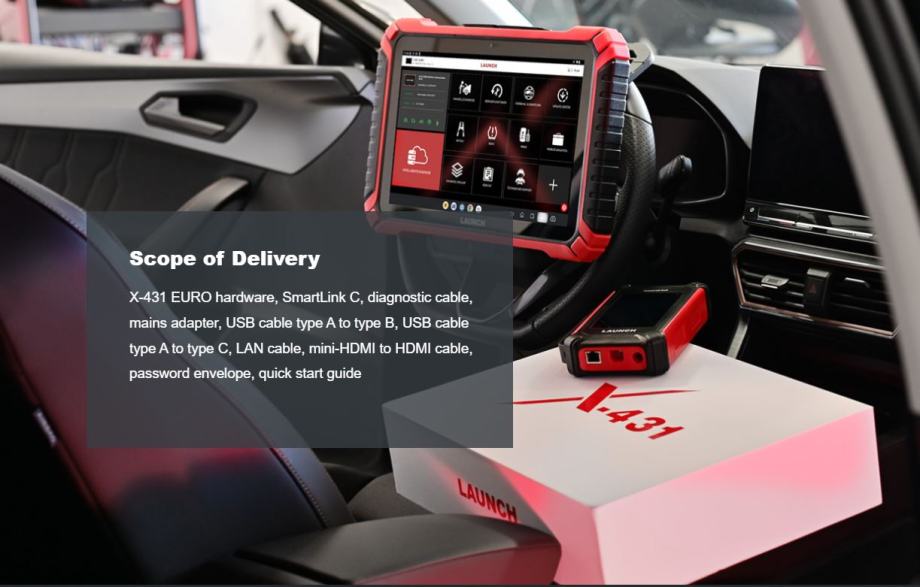 Novi Launch X-431 EURO je vrhunska oprema s najnovijom tehnologijom. Oprema je zaštićeni tablet s operativnim sustavom Android 13, ima osmojezgreni procesor frekvencije 2,0 GHz, veliki zaslon (13,6" inča, 2560x1600), 12 GB RAM-a, 512 GB interne memorije i snažan baterija kapaciteta 71,1 Wh (9,360 mAh) Launch X-431 EURO izrađena je u novom dizajnu i ima novo sučelje s prilagodljivim zaslonom glavnog izbornika s zasebnim prozorom za pregled statusa softvera Uređaj je opremljen novim dijagnostičkim konektorom Smartlink C V3.0 (CANFD / DoIP / J2534 Pass-Thru i drugi), koji vam omogućuje skeniranje vozila. sustavi još brži, uz sve standardne profesionalne dijagnostičke funkcije, uređaj ima nove funkcije, kao što su: pregled trenutnih podataka iz različitih sustava u isto vrijeme, novi vizualizirani radni koraci koji prikazuju podatke u stvarnom vremenu. stream, kombinirajući dijagnostiku i bazu podataka u načinu rada podijeljenog zaslona i nove stručne funkcije za automobile kao što su BMW, Audi, Mercedes-Benz, Tesla, FCA i druge marke i druge funkcije. Za Launch X-431 EURO dostupan je i novi model softvera, podijeljen u tri verzije: Bronze, Silver i Gold. Također, za Launch X-431 EURO dostupni su svi mogući dodaci i dodaci kao što su: HD softver za kamione i drugi teški transport, softver za motocikle i drugi moto transport, ADAS, X-PROG, Scopebox, Sensorbox, TPMS , EV oprema i još mnogo toga.