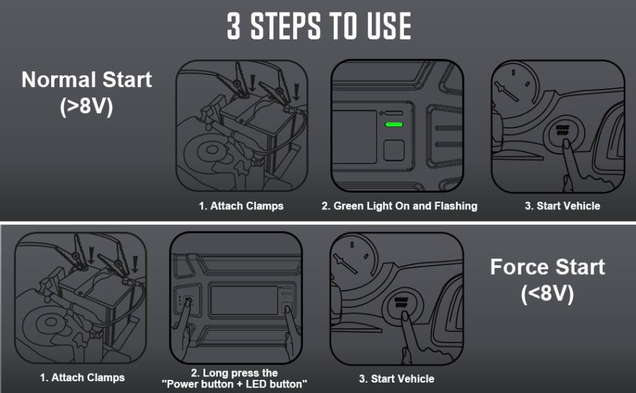 SNAŽAN: J402 akumulatorski startni starter ima večernju startnu struju 3000A, nakon potpunog punjenja može postići 60 puta brzi start. Prikladno za benzinske motore ispod 8,5 litara i dizel motore ispod 6,5 litara, uključujući: automobile, motocikle, čamce, kampere, terenska vozila, kombije, traktore, kosilice i još mnogo toga.