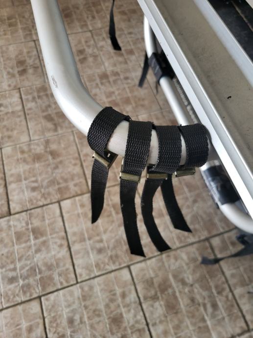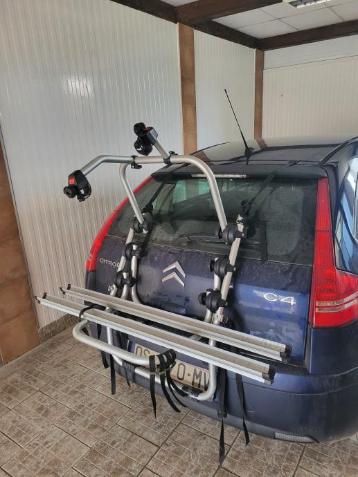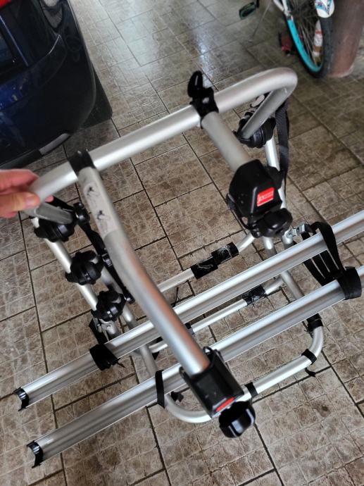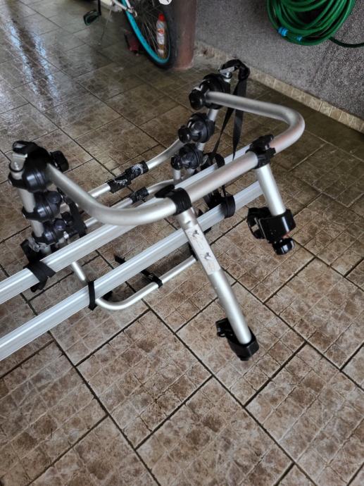 Auto nosač za dva bicikla, aluminijski. Nosač se lako montira i skida na 5. vrata. Korišten samo jednom na kraćoj relaciji, gotovo novi, kao iz trgovine. Posjeduje svu opremu!