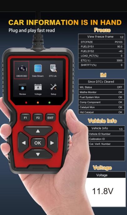 • Osnovne OBD2 funkcije: čitanje i brisanje DTC kodova, isključivanje Check Engine lampice, prikaz freeze frame podataka, I/M readiness test, očitanje VIN broja, test napona akumulatora, live stream podaci s grafovima, O2 senzor test, onboard monitoring, komponentni testovi.