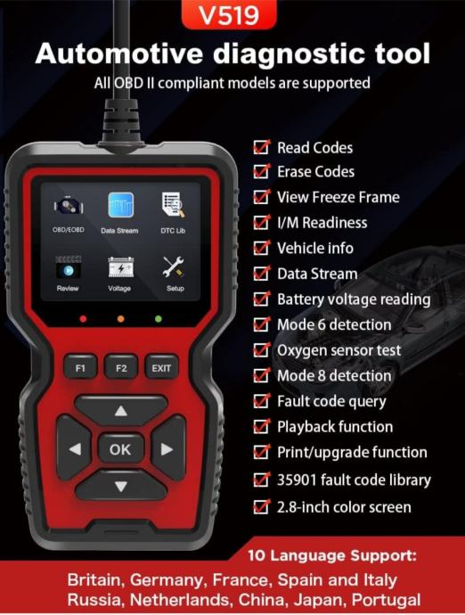 OBD2 V519 je dijagnostički alat za vozila koji podržava sve osnovne OBD2 funkcije i nudi dodatne napredne opcije.