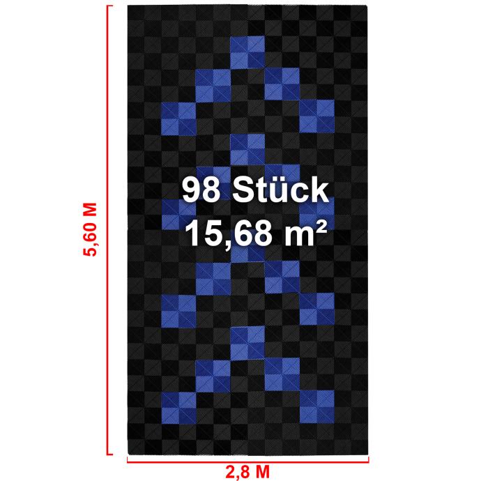 S 98 visokokvalitetnih podnih pločica u praktičnom formatu 40x40 cm dobivate ukupnu površinu od 15,68 m² - savršeno prilagođenu standardnim dimenzijama garaže od 2,80 m x 5,60 m. Za dizajn uzorka dobit ćete 78 podnih pločica u osnovnoj boji i 20 podnih pločica u akcentnoj boji.