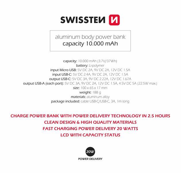 aluminijski power bank kapaciteta 10.000mAh, microUSB i USB-C ulazi, 2xUSB-A, 1xUSB-C izlazi te PD i QC brzo punjenje. Pakirano u SWISSTEN blisteru.
