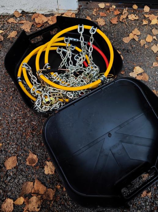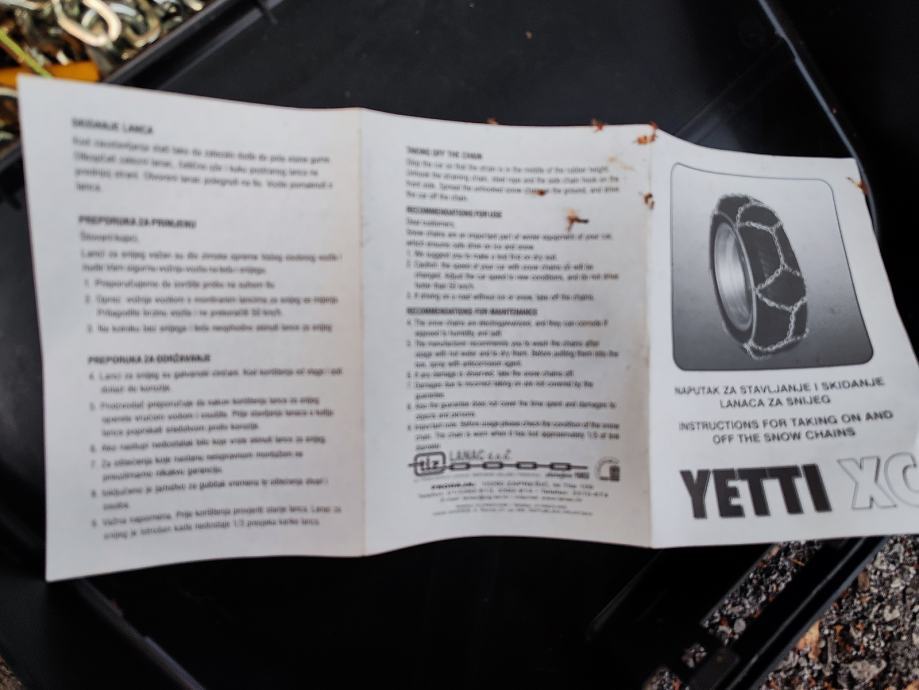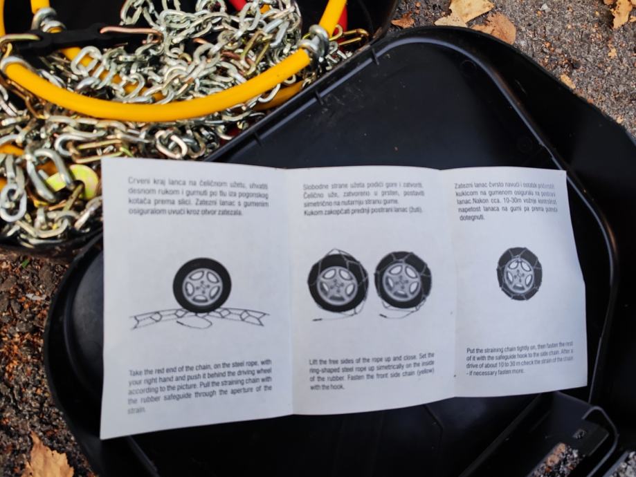 Prodajem lance za snijeg, nekorišteni. Na drugoj slici su napisane za koje dimenzije guma odgovaraju lanci. Cijena 15 Eura.