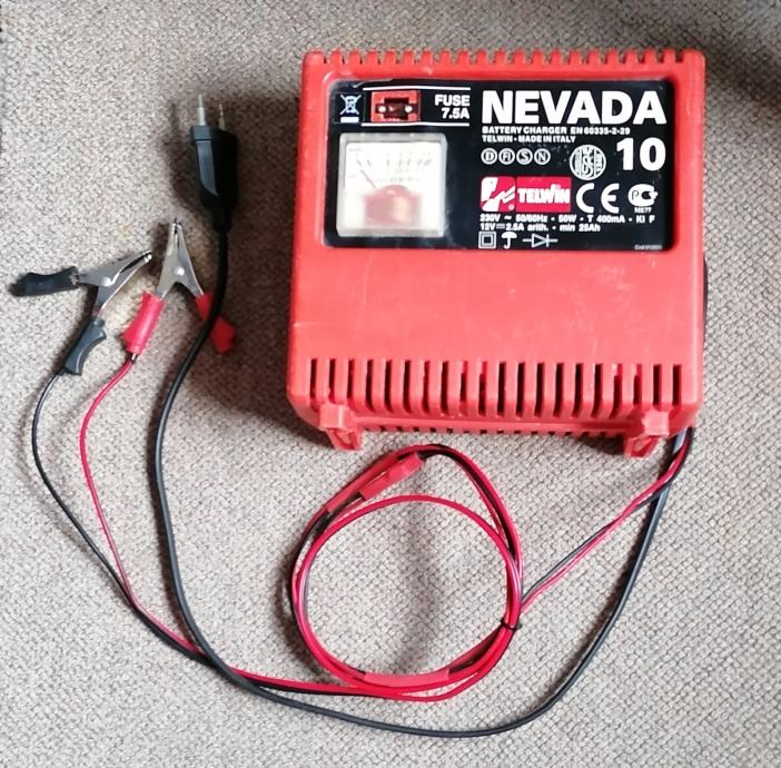 Model: NEVADA 10 jačina struje 4A eff / 2,5A arith. spori punjač za punjenje olovno-kiselinskih akomulatora min. 25Ah do 55Ah, jače akomulatore može nadopunjavati.