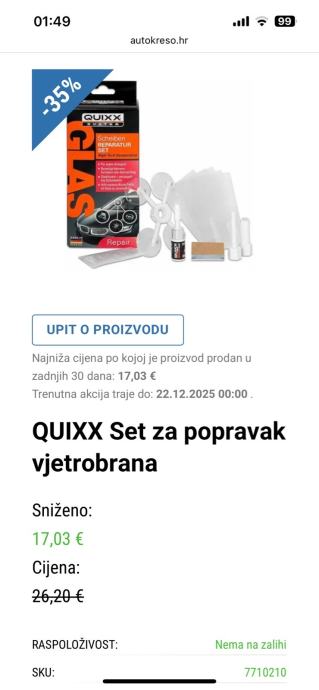 QUIXX set za popravak vjetrobranskog stakla za automobile kombije za sva vozila! NOVO! ZAPAKIRANO! CIJENA ZA SET CIJENA 11€ Upitati na 091/978-9684 (POZIV,SMS,MOŽE I UPIT INBOX) Moguća dostava Zagorje,Zagreb,Lepoglava,Ivanec,Varaždin!