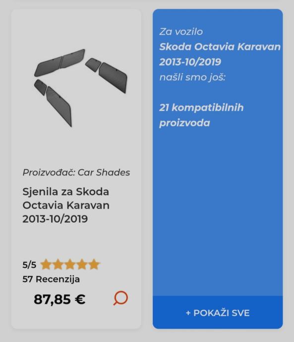 Prodajem sjenila za navedeni model.Pašu ISKLJUČIVO na Octavia combi(karavan) izvedbu. Sjenila štite od sunčeve svjetlosti te daju privatnost jer se ponašaju kao zatamljena stakla, dok iznutra ne ometaju u vožnji jer su 99% prozirna. Dolazi 6 komada sjenila. Korištena su svega 5 mjeseci. Stanje je 10/10